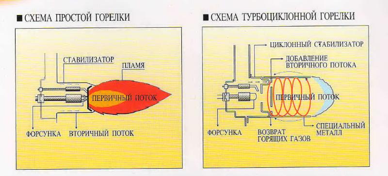 - применение собственных, запатентованных «турбоциклонных» горелок с двойным дожигом топлива, позволяет не только обеспечить полное сгорание топлива, но и работу котла при особо низком давлении природного газа в сетях, вплоть до 30 мм возд.столба. Это особенно важно в зимних условиях, когда зачастую давление в сетях резко падает;