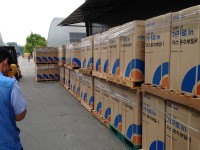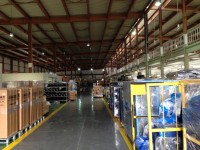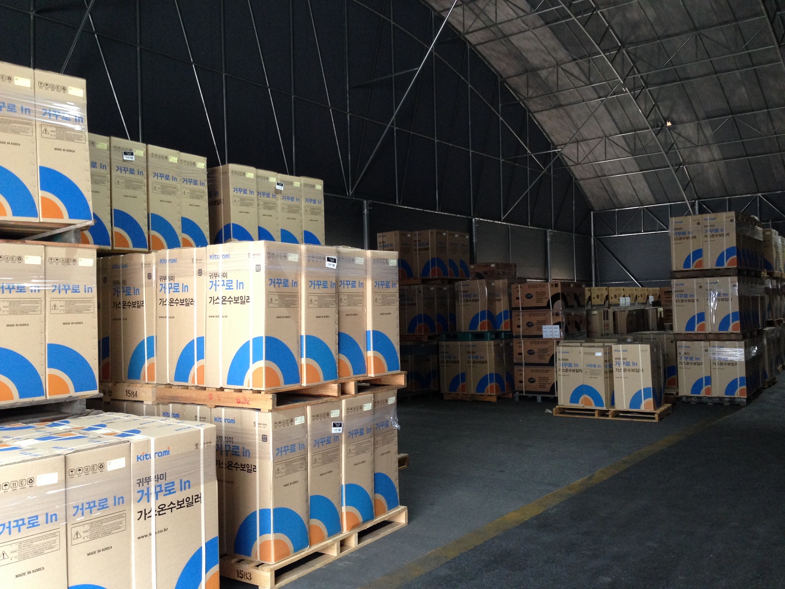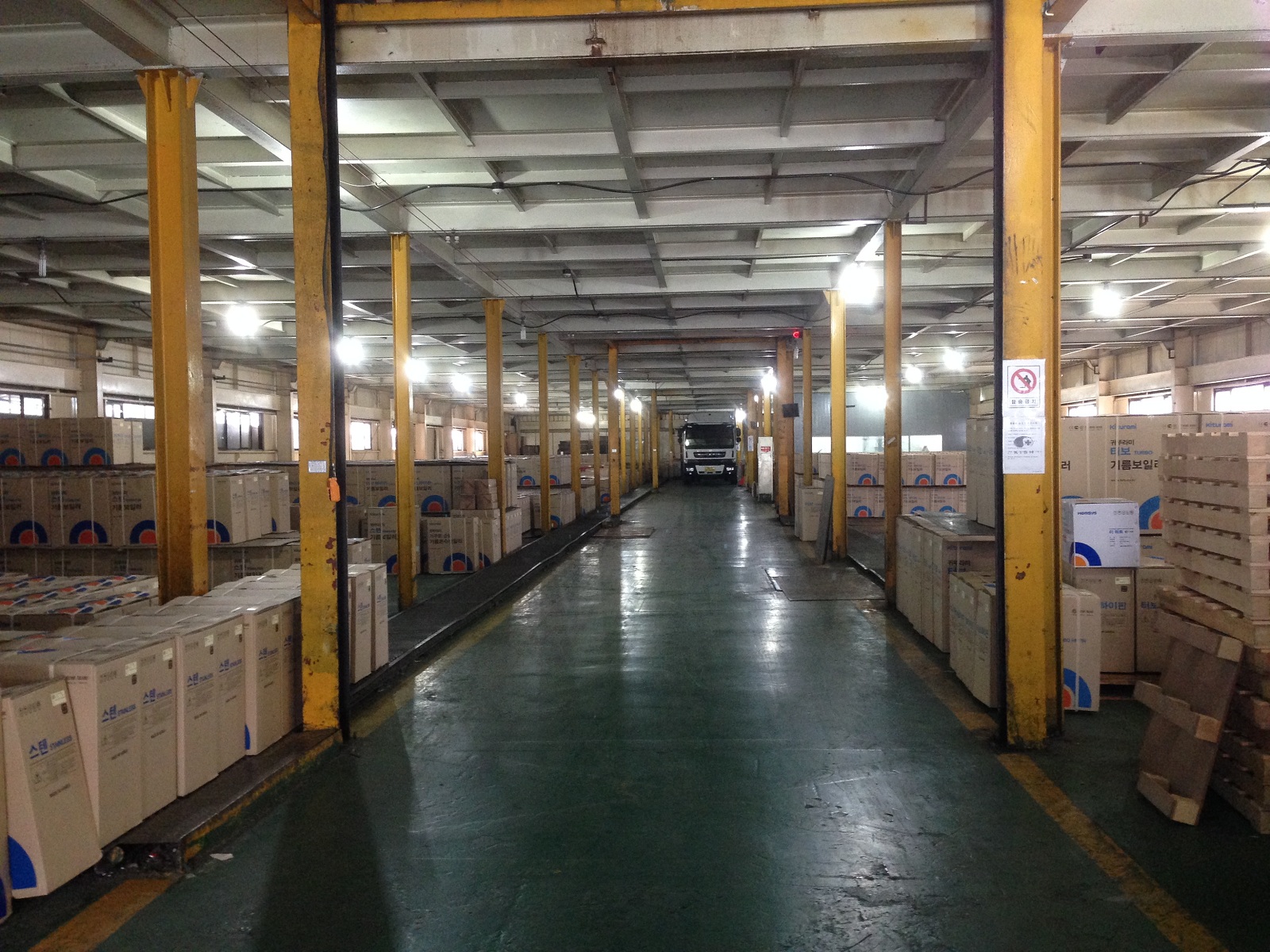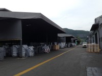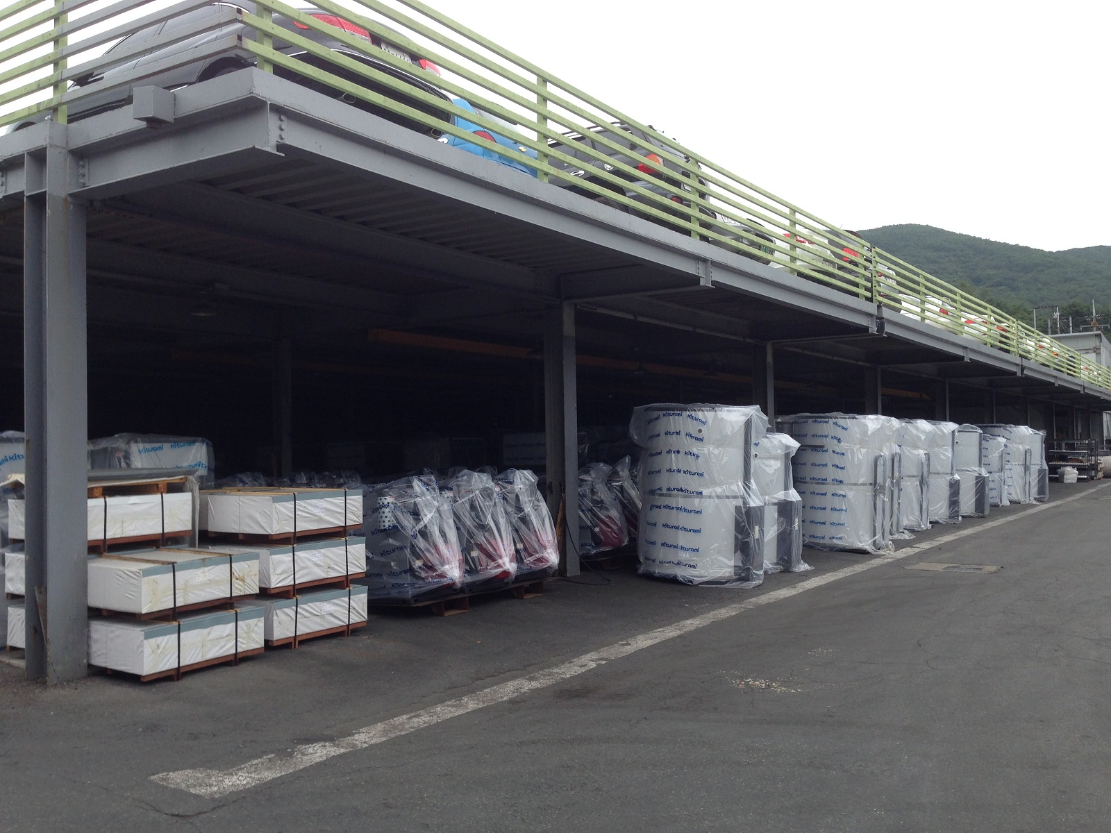 Пост взвешивания ввозимого сырья и материалов. Складское помещение с использованием 2-го уровня под парковку автомашин сотрудников. Склад готовой продукции завода Китурами в Чхондо.