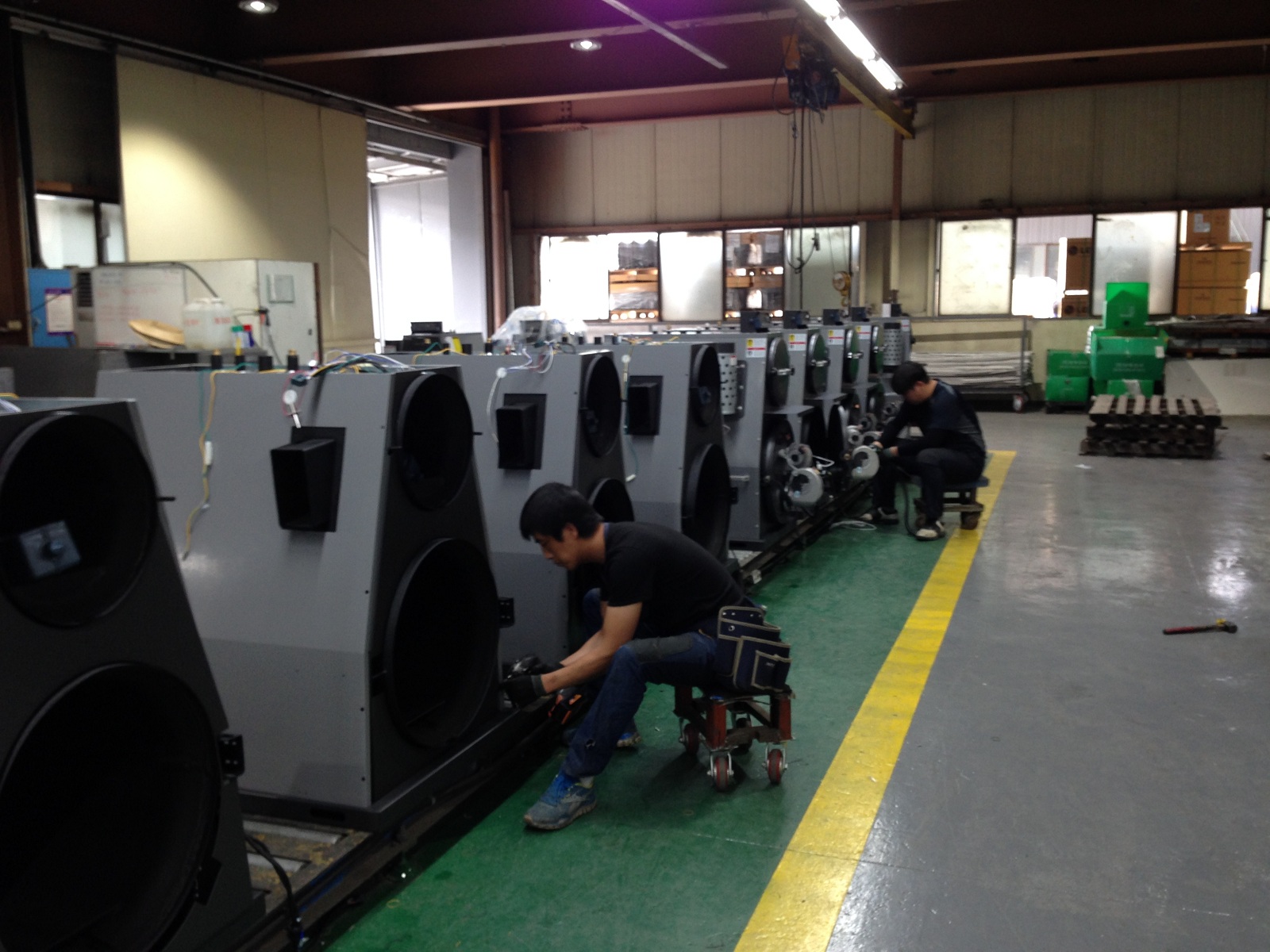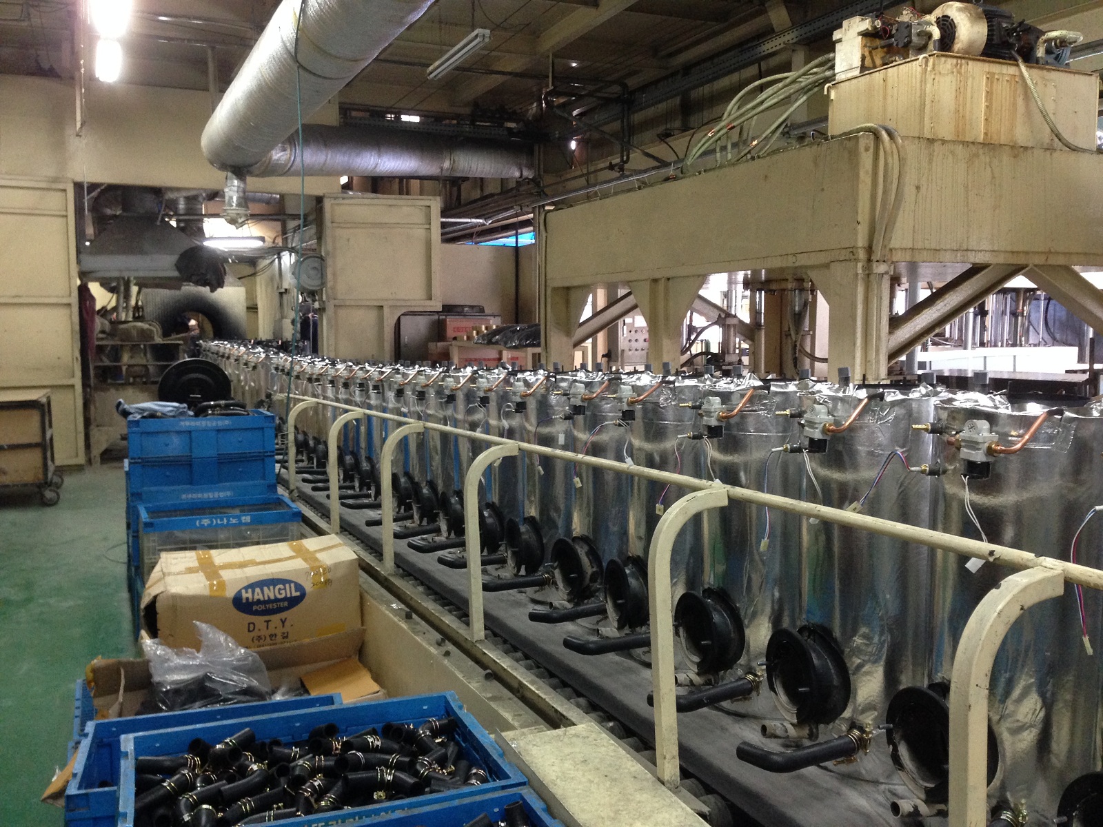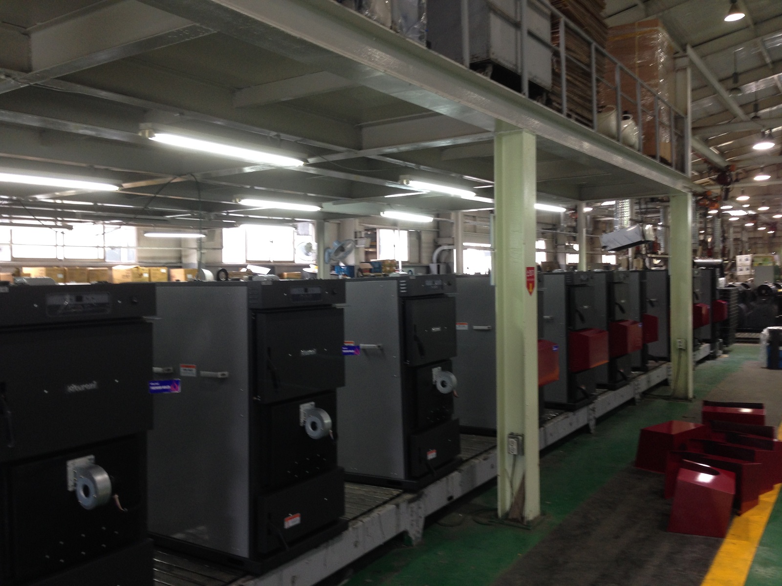 Сборочный конвейер напольных котлов малой мощности. Проверка работоспособности теплообменников лазерным "обжигом". Одно из складских помещений.