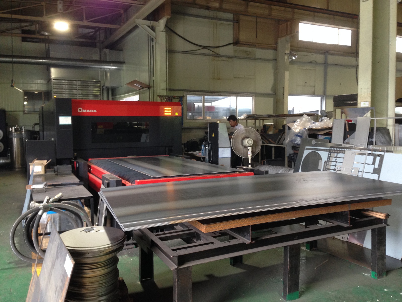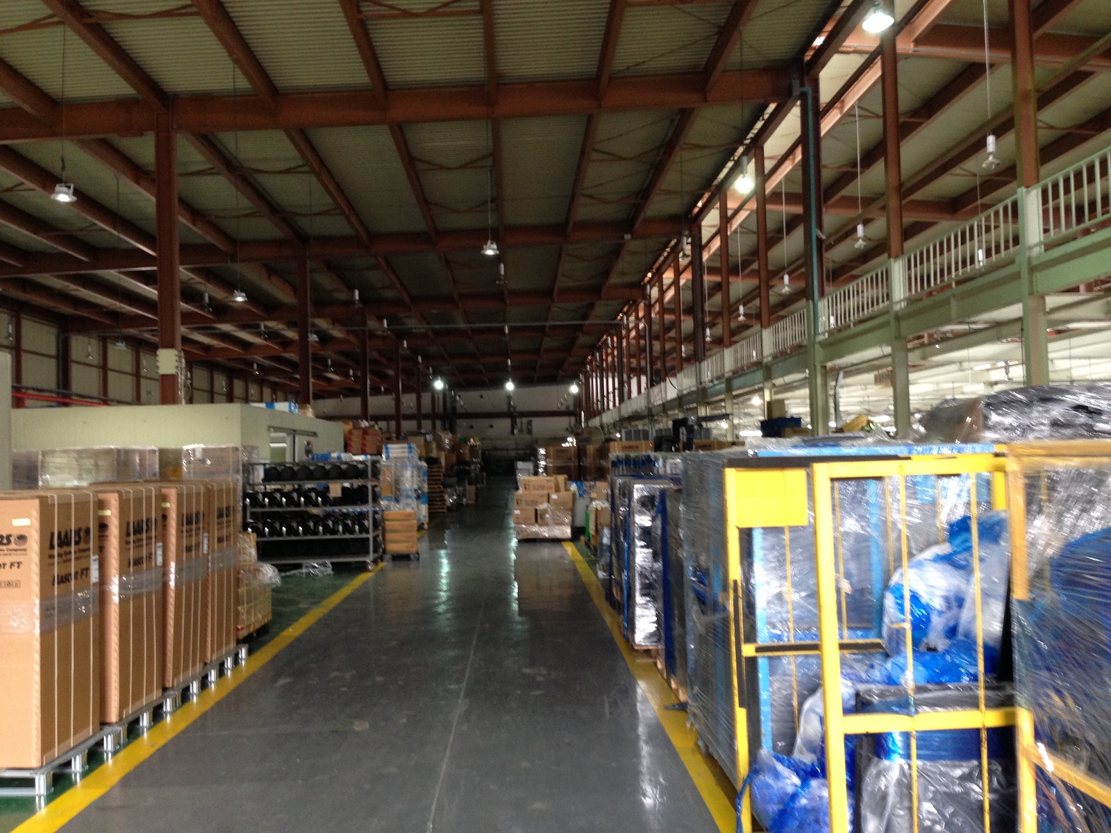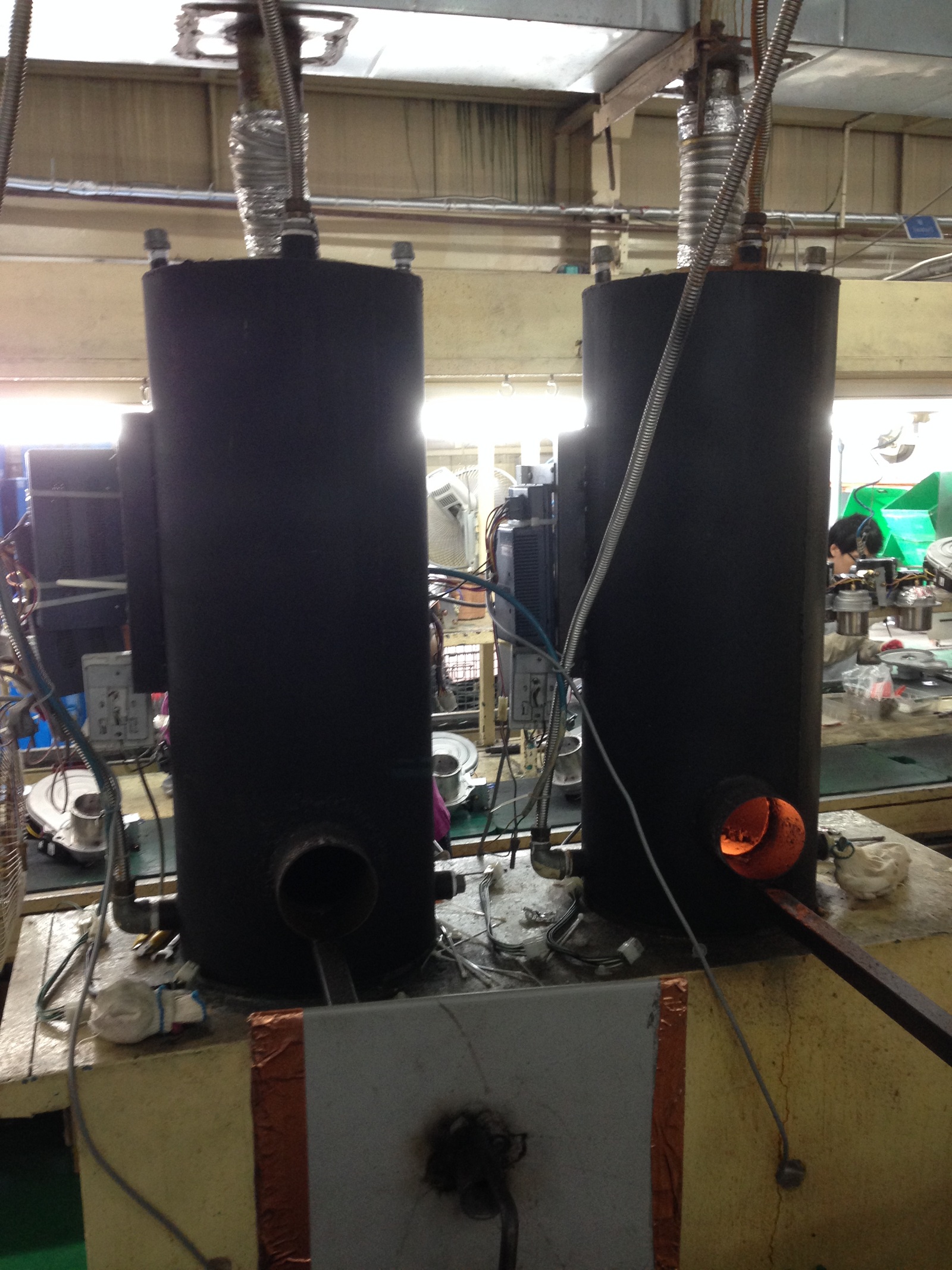 Сборочный конвейер напольных котлов малой мощности. Проверка работоспособности теплообменников лазерным "обжигом". Одно из складских помещений.