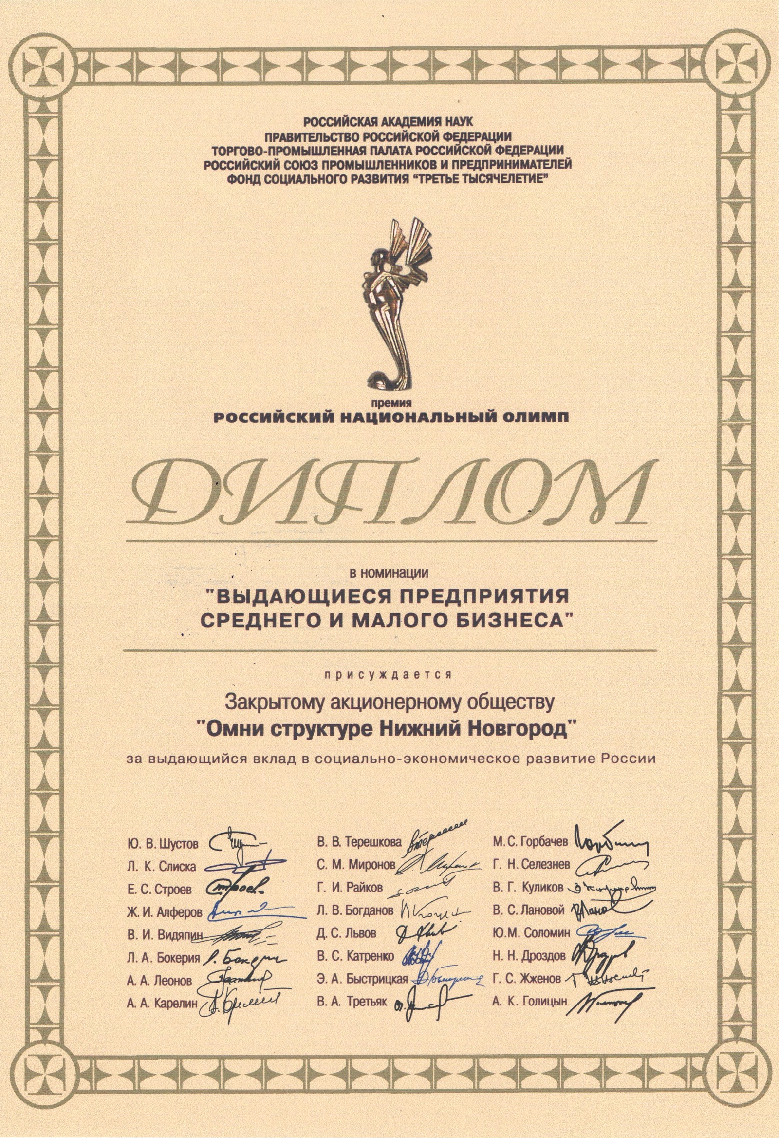 За эти работы ЗАО Омни Структуре НН , руководимое его президентом Титовым Ю.М., "За выдающийся вклад в социально-экономическое развитие России" было удостоено высокой награды - Премией "Российский Национальный Олимп".